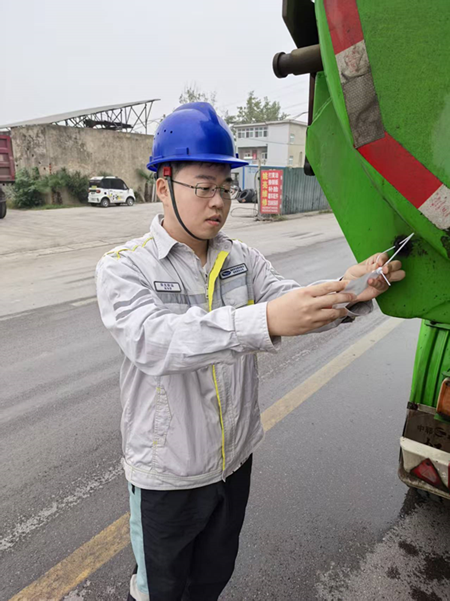 圖為:陳華羿在潘集選煤廠給車輛施加鉛封,保障煤炭在途安全。